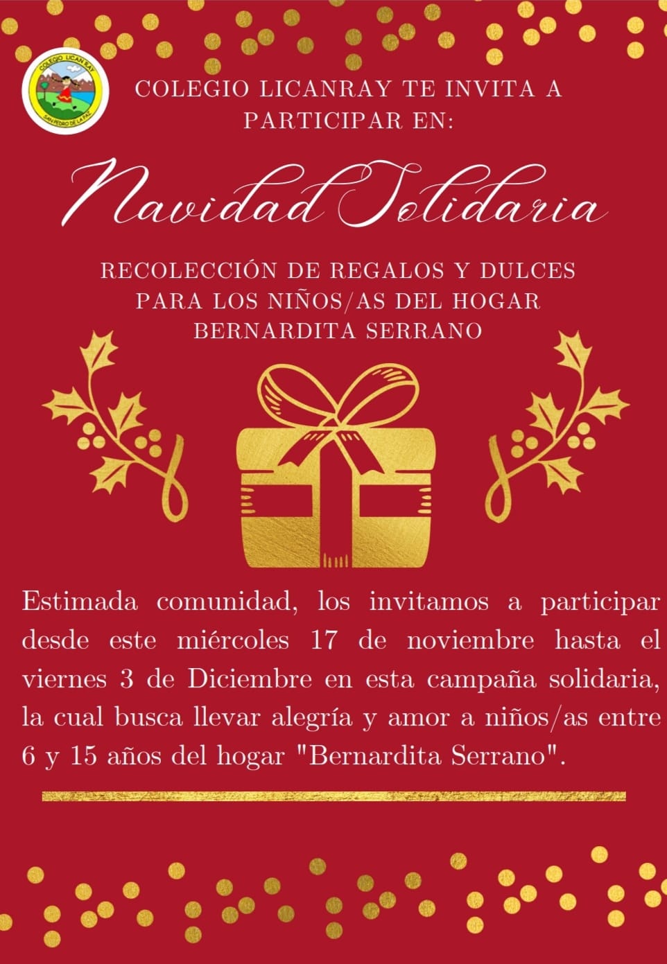 01 Dic2021Diciembre 1, 2021Navidad solidaria Desde el miércoles 17 de noviembre hasta el 3 de diciembre puedes llevar dulces o regalos para los niños/as del hogar Bernardita Serrano.